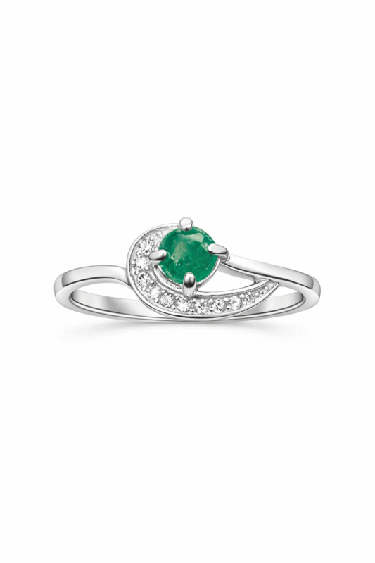 Anillo elaborado en plata ley 925, con una esmeralda colombiana natural talla cabuchón como protagonista, acompañada por delicados circones blancos engastados en uno de sus laterales. Su diseño envolvente combina líneas orgánicas y elegantes que realzan el color profundo de la esmeralda, creando una pieza sofisticada y femenina. Ideal para uso diario o como joya statement en ocasiones especiales.