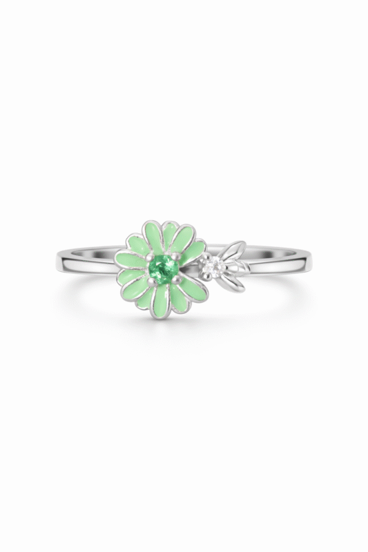 Anillo floral elaborado en plata ley 925, con una esmeralda colombiana natural engastada al centro y pequeños circones que acompañan el diseño. Su forma de flor simboliza crecimiento y armonía, mientras que la esmeralda aporta un verde intenso y luminoso que realza la pieza. Ligero, elegante y femenino, ideal para uso diario o como detalle especial en ocasiones importantes.