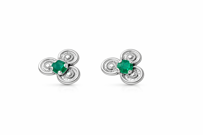 Aretes tipo trébol geométrico elaborados en plata ley 925, con una esmeralda colombiana natural como centro de la pieza y delicados circones blancos que forman espirales de luz alrededor de cada pétalo. Su diseño combina precisión, brillo y armonía, convirtiéndolos en un accesorio sofisticado, elegante y fácil de llevar tanto de día como de noche.