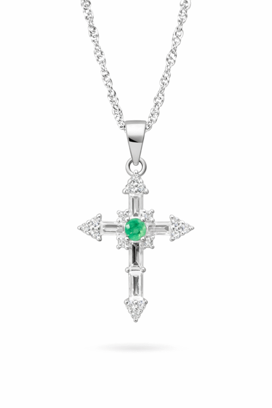 Dije en forma de cruz estilizada elaborado en plata ley 925 italiana, con una esmeralda natural colombiana como corazón central y circones blancos en talla marquise que recorren los brazos de la cruz.