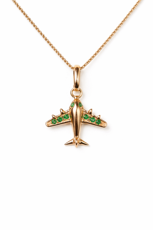Dije con diseño de avión estilizado elaborado en oro italiano de 18K, detallado con circones verdes brillantes engastados en las alas, que aportan color, dinamismo y sofisticación. Su acabado pulido resalta las líneas aerodinámicas de la pieza, convirtiéndola en un accesorio moderno y con carácter. Ideal para quienes aman viajar, explorar y avanzar hacia nuevos horizontes.