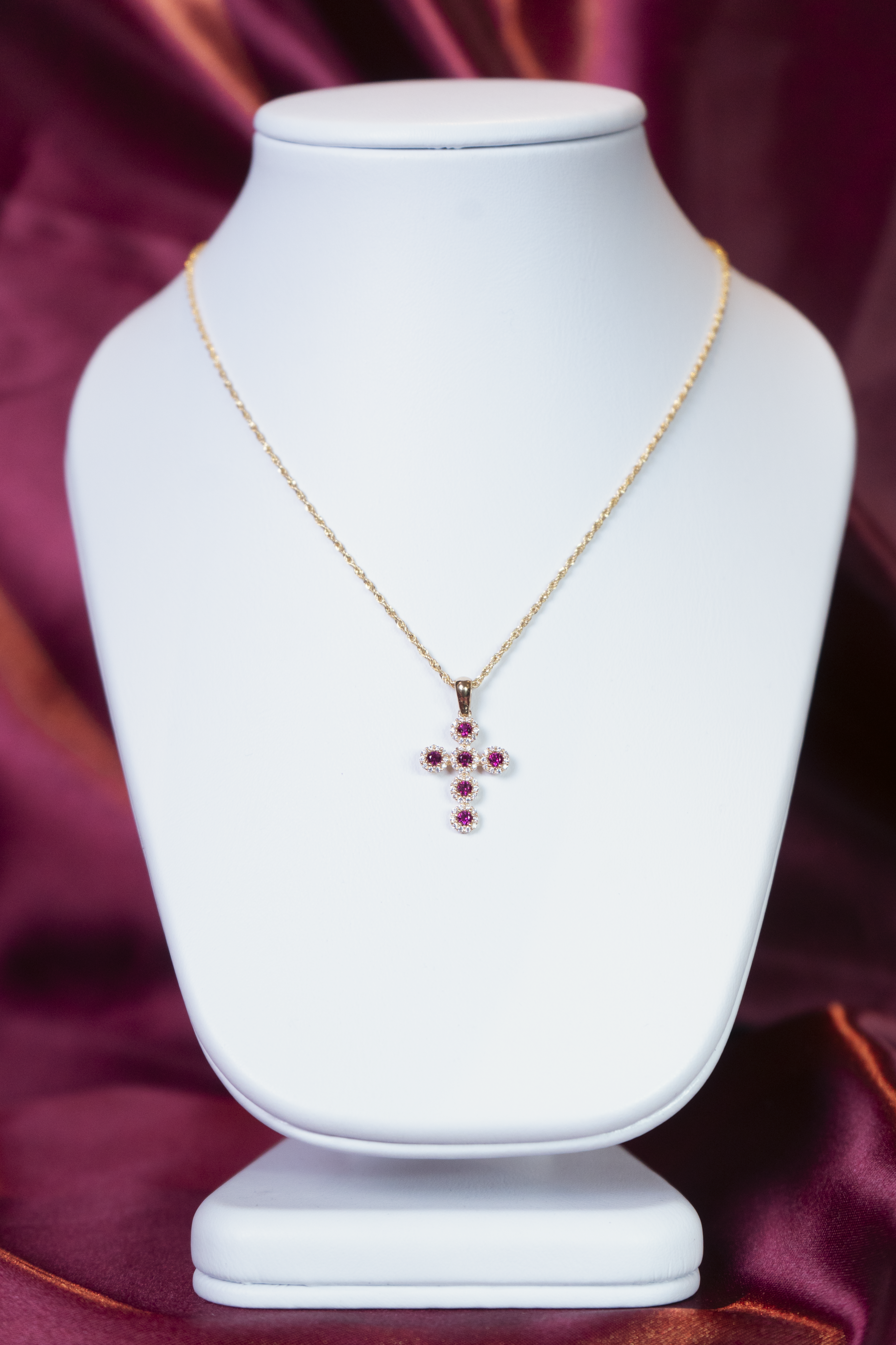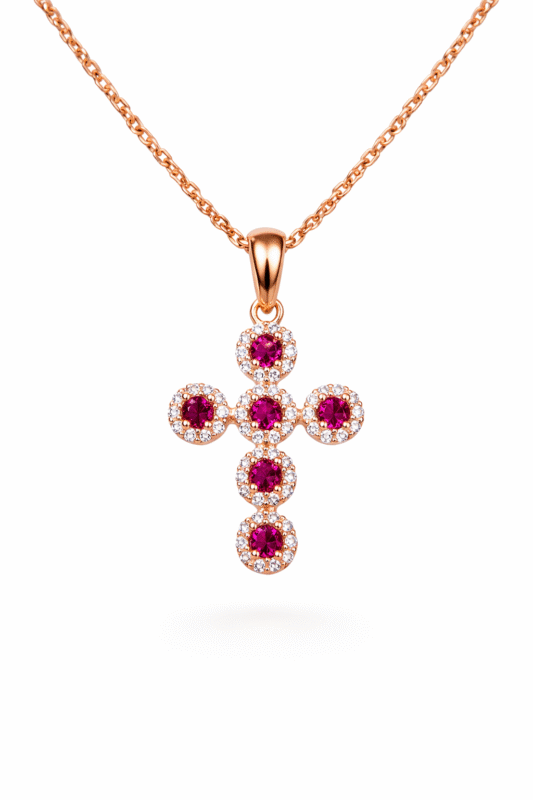 Dije en forma de cruz clásica elaborada en oro italiano de 18K, compuesta por centros de moissanita rodeados de delicados circones brillantes que aportan profundidad, luminosidad y contraste elegante. Su diseño equilibrado y refinado combina devoción y lujo contemporáneo, convirtiéndola en una pieza significativa y sofisticada para uso diario o momentos especiales. Ideal para llevar sola o con cadenas finas.
