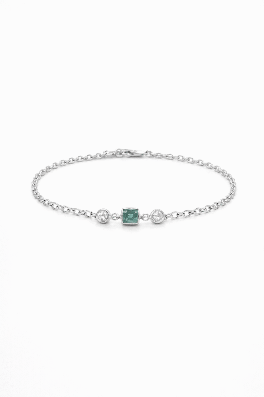 Pulsera elaborada en plata ley 925, con eslabones delicados y un centro destacado con esmeralda colombiana natural, acompañada de detalles brillantes en circon blanco que enmarcan la piedra principal. Su diseño equilibrado combina elegancia y luminosidad, convirtiéndola en una pieza versátil para uso diario o para ocasiones especiales donde se busque un toque sutil pero sofisticado.